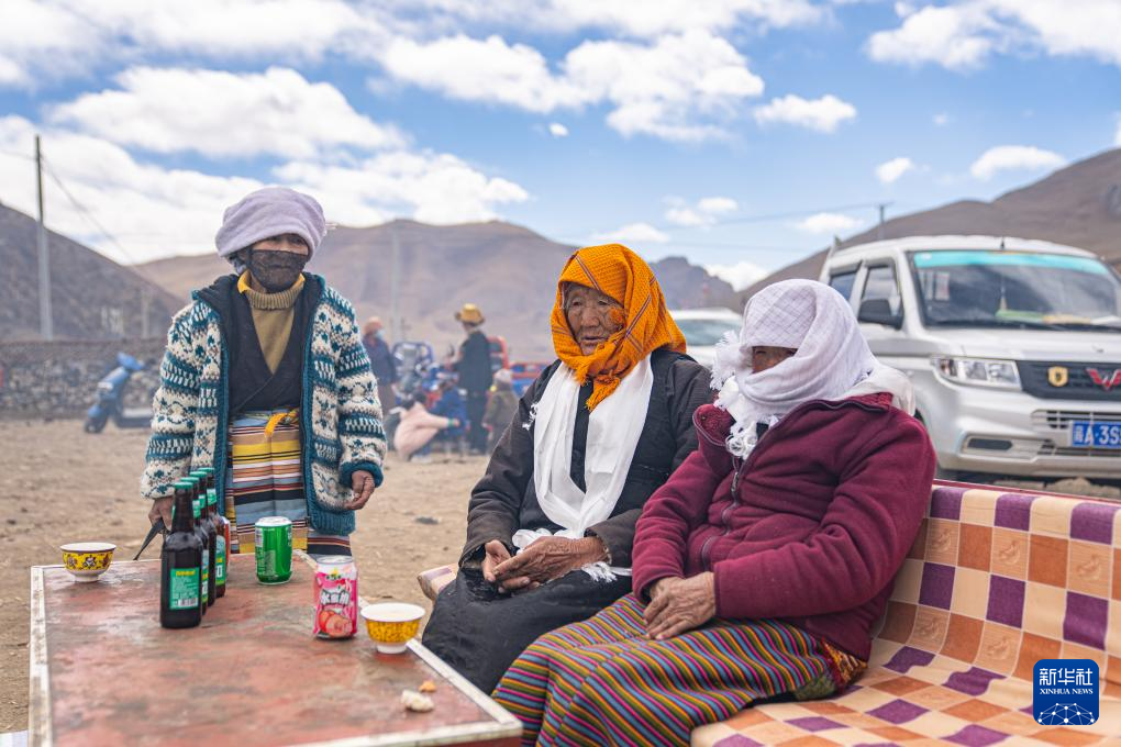 在春耕大典上,白姆老人(左二)和鄉(xiāng)親一起跳鍋莊(3月16日攝)。新華社記者 晉美多吉 攝