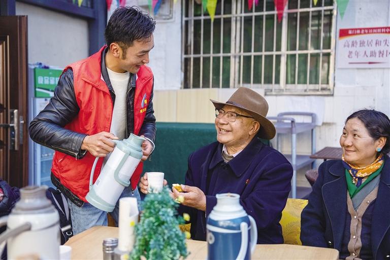 “波啦,您來(lái)啦,快坐下來(lái)喝點(diǎn)熱茶?!薄澳?,待會(huì)午飯?jiān)谶@邊吃嗎?”近日,記者來(lái)到拉薩市城關(guān)區(qū)蕃陽(yáng)社會(huì)工作者和志愿者服務(wù)協(xié)會(huì)下的策門(mén)林老年日間照料中心,剛進(jìn)大門(mén)就被一群正在鍛煉身體的老人所吸引。他們跟著老師抬手、踢腿、扭腰,動(dòng)作整齊劃一,臉上洋溢著幸福的笑容。鍛煉結(jié)束后,赤來(lái)回到助餐區(qū),邊喝甜茶邊吃“卡賽”,和老人們分享趣聞,拉著家常,現(xiàn)場(chǎng)傳來(lái)一陣陣歡聲笑語(yǔ)。