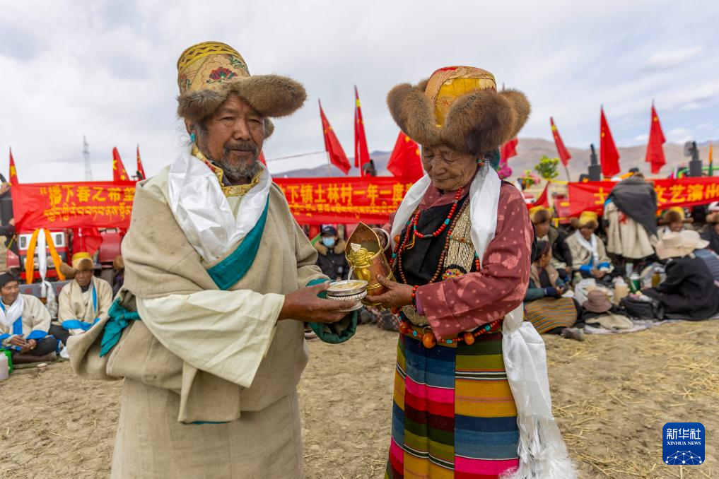 作為村中長者,尼瑪(左)在春耕儀式上接受敬酒(3月16日攝)。新華社記者 姜帆 攝