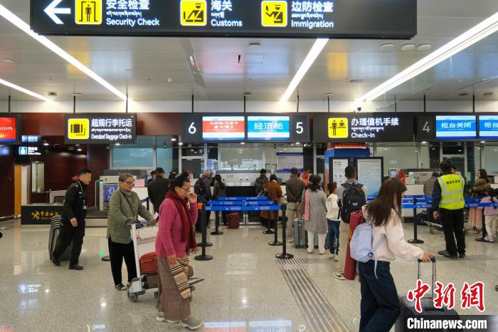 圖為3月31日,由拉薩飛往尼泊爾博卡拉的旅客在拉薩貢嘎國際機(jī)場辦理乘機(jī)手續(xù)。江飛波 攝