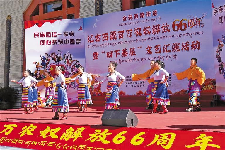 圖為拉薩市城關(guān)區(qū)金珠西路街道舉辦紀(jì)念西藏百萬農(nóng)奴解放66周年暨“四下基層”文藝匯演活動現(xiàn)場。通訊員 扈顯嶺 攝