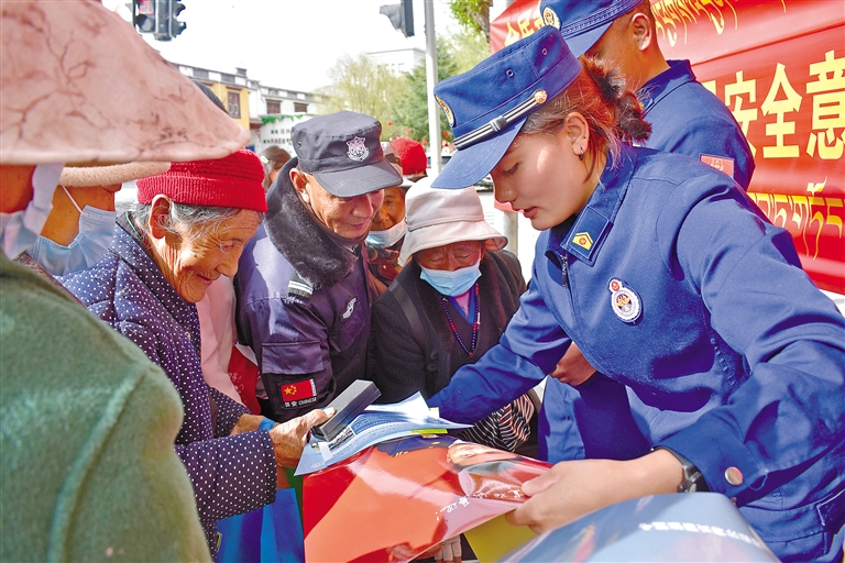 4月15日,山南市瓊結(jié)縣組織開展第十個(gè)全民國家安全教育日系列宣傳活動(dòng)。圖為瓊結(jié)縣消防救援大隊(duì)工作人員向群眾發(fā)放宣傳資料。記者 孫開遠(yuǎn) 攝