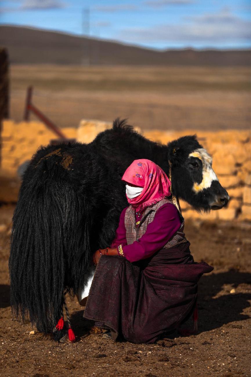 作品簡(jiǎn)介:一位牧女戴著紅色頭巾與白色面罩,半蹲著給牦牛擠奶。