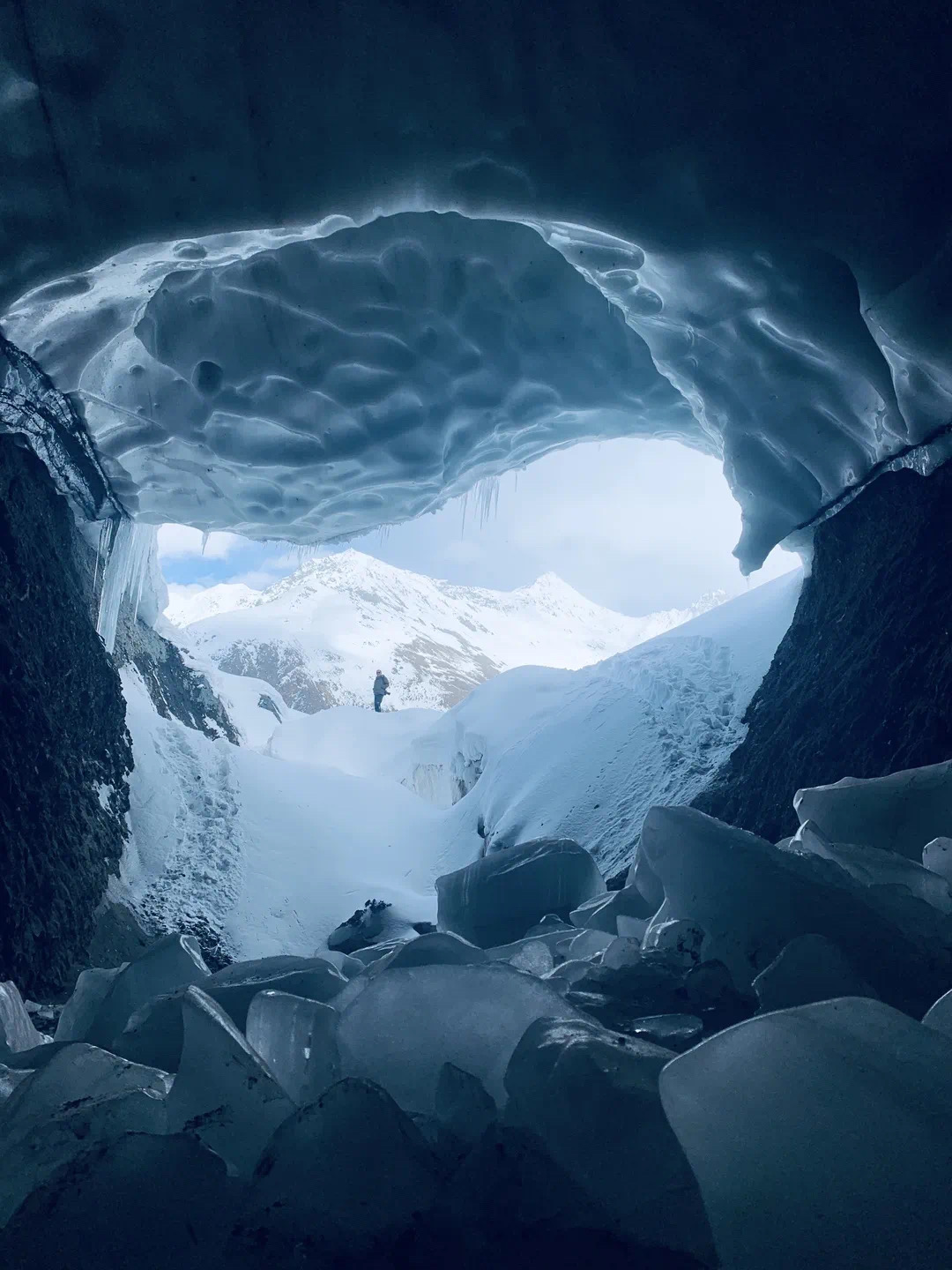 冰洞入口高約1米,需要彎著腰才能進(jìn)入。待完全進(jìn)入后,空間逐漸開闊,冰洞內(nèi)別有洞天。冰壁深處透著蔚藍(lán),似是把邊壩的藍(lán)天鎖了進(jìn)去。冰洞最開闊的地方有一處冰臺,游客在那里打卡拍照,記錄下這絕美的風(fēng)光。
