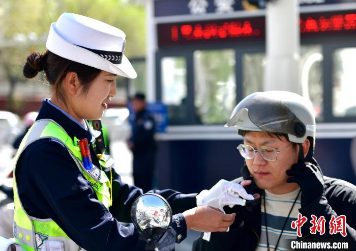 圖為拉薩市公安局交警支隊城北大隊副大隊長胡花芳為駕駛員調(diào)節(jié)頭盔。李林 攝