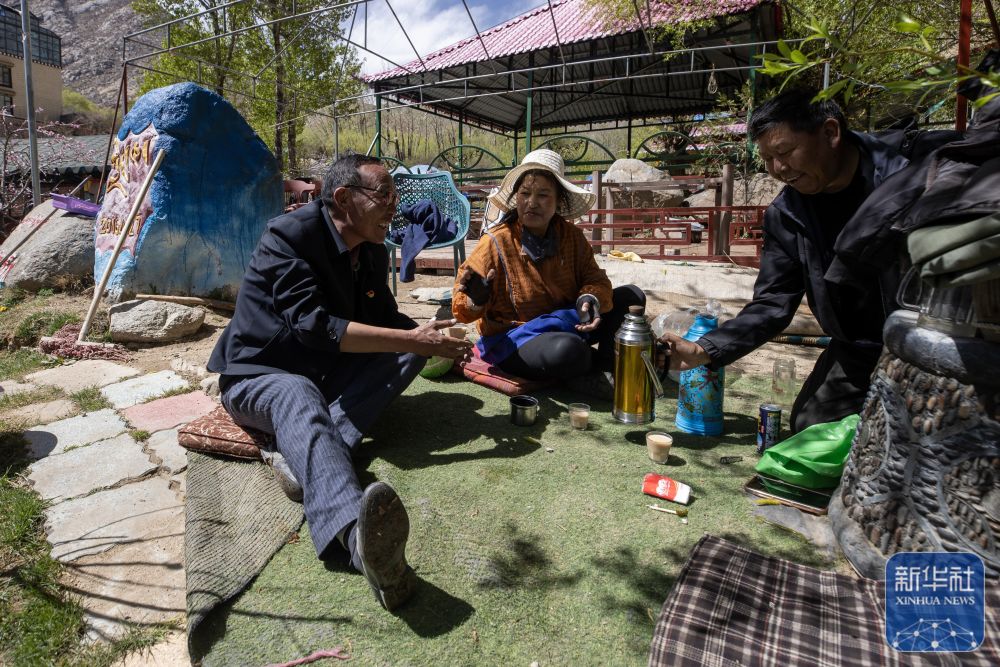 尼瑪(左)在村里與一家農(nóng)家樂的經(jīng)營者交談(4月24日攝)。