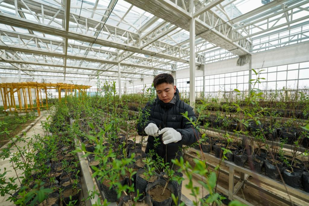 2025年4月25日,那曲市林業(yè)和草原局工作人員在那曲高寒高海拔鄉(xiāng)土樹(shù)種培育基地給樹(shù)苗剪枝。新華社記者 晉美多吉 攝