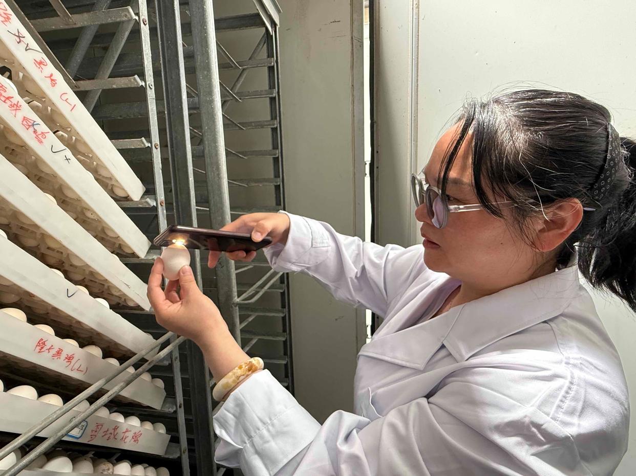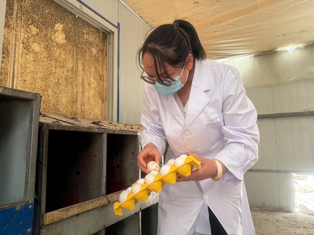 圖為馮靜在檢查雪域白雞的孵化情況