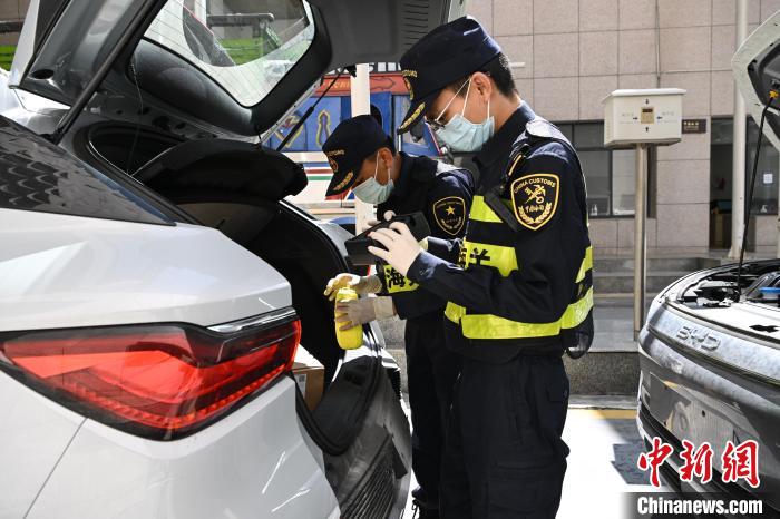 5月25日,在西藏自治區(qū)日喀則市吉隆縣的吉隆口岸,海關(guān)工作人員在對出口的國產(chǎn)新能源汽車進行檢查。中新社記者 貢嘎來松 攝