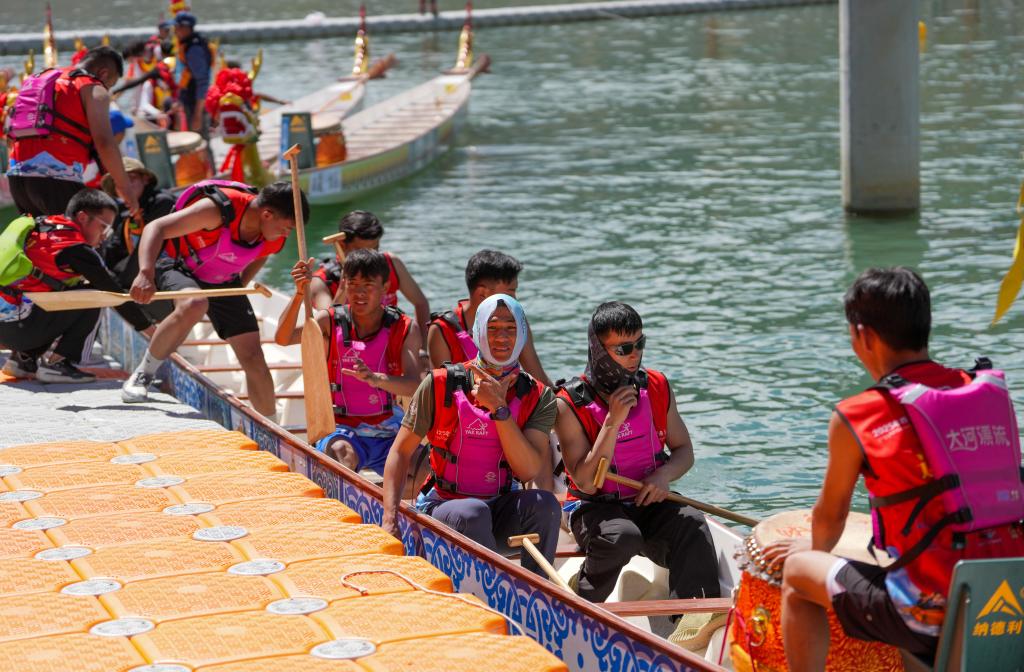 ↑5月31日,在拉薩市濱河公園旁的水域內(nèi),選手們正在準備出發(fā)。新華社記者 晉美多吉 攝