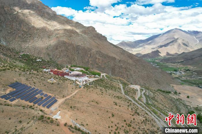 5月29日,航拍拉薩乃朗寺光伏電站,該電站年發(fā)電量約100萬千瓦時,并配備光儲充一體化系統(tǒng),可完全滿足寺廟的使用需求。(無人機畫面)中新社記者 江飛波 攝