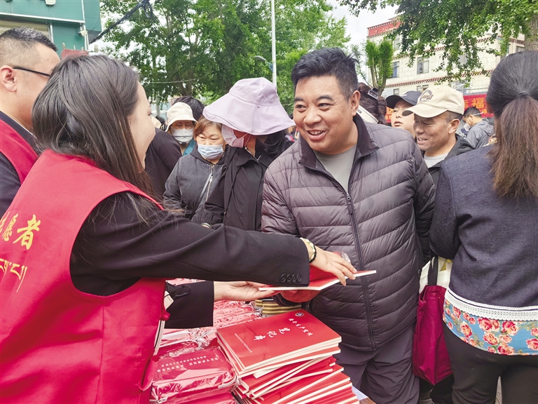 工作人員給社區(qū)居民發(fā)放安全宣傳資料。記者 張雪芳 攝