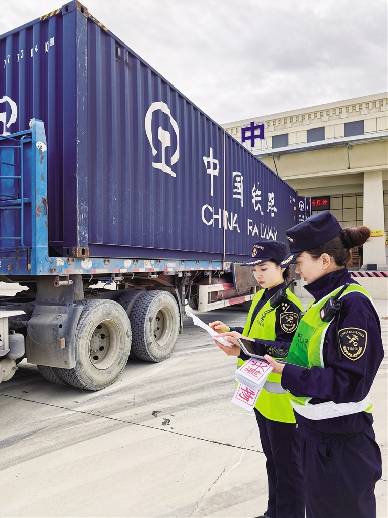 拉薩海關(guān)所屬日喀則海關(guān)在國(guó)際陸地港現(xiàn)場(chǎng)監(jiān)管南亞班列轉(zhuǎn)關(guān)貨物。圖由拉薩海關(guān)提供