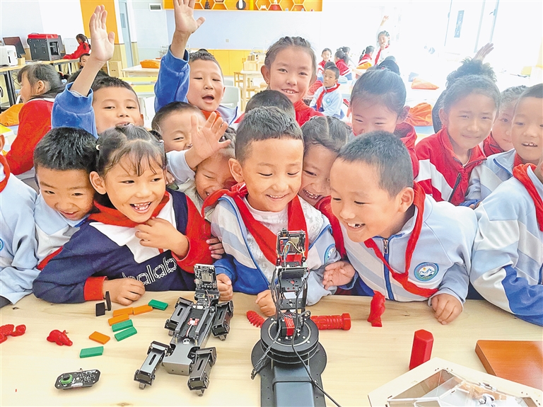 在桑珠孜區(qū)青島小學(xué)的科學(xué)課堂上,智能實(shí)驗(yàn)臺(tái)前圍滿了興致勃勃的孩子,他們手持 3D 打印筆,精心繪制著心中的“太空基地”。作為西藏首個(gè)啟動(dòng)“ STEM ”科學(xué)課程的地區(qū),這里不僅建成了全區(qū)首個(gè)小學(xué)科創(chuàng)實(shí)驗(yàn)室,還被教育部認(rèn)定為西藏唯一的全國(guó)“白名單”科創(chuàng)賽事基層組織單位。“以前,孩子們只能從課本上了解實(shí)驗(yàn),現(xiàn)在能親手操作機(jī)器人、設(shè)計(jì)航天模型?!鼻鄭u小學(xué)黨支部書(shū)記周杰介紹道??苿?chuàng)課程的開(kāi)展,如同一把鑰匙,打開(kāi)了孩子們創(chuàng)新思維和科學(xué)探索的大門,為高原青少年搭建起展示科學(xué)素養(yǎng)與創(chuàng)新能力的舞臺(tái),推動(dòng)當(dāng)?shù)亟逃聵I(yè)邁向新高度。