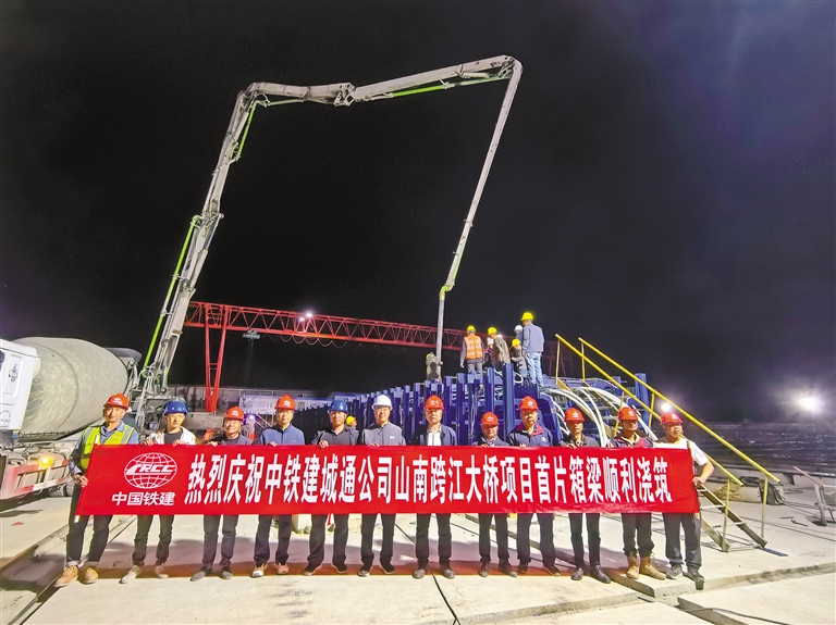 中鐵建城通公司山南跨江大橋項目首片箱梁順利澆筑合影。記者 武沛濤