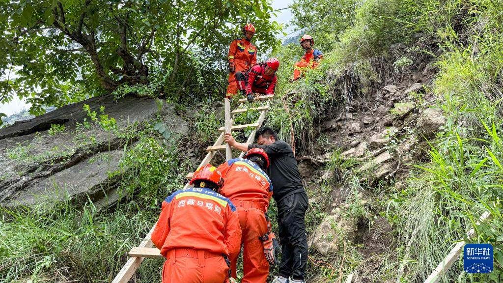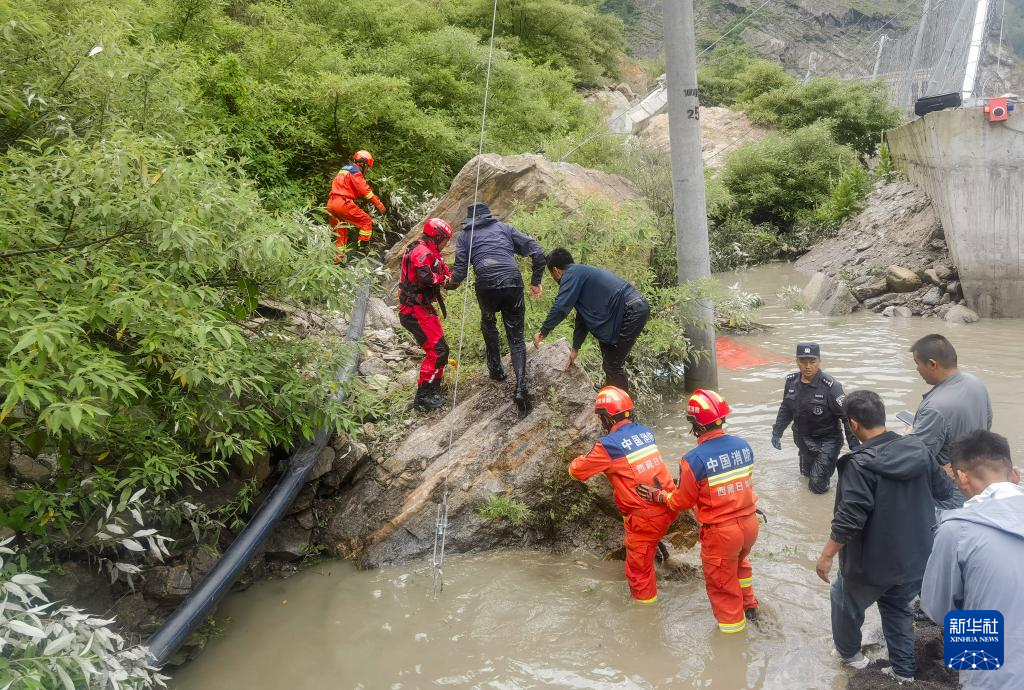 7月8日,西藏消防救援總隊(duì)救援人員在救災(zāi)現(xiàn)場(chǎng)搭建救援通道。新華社發(fā)(徐達(dá)富攝)