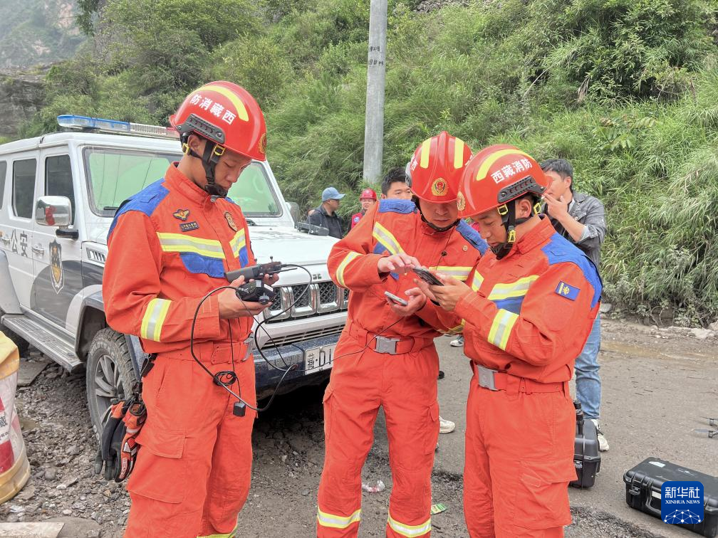 7月8日,西藏消防救援總隊(duì)救援人員在救災(zāi)現(xiàn)場(chǎng)搭建4G單兵圖傳系統(tǒng)。新華社發(fā)(徐達(dá)富攝)