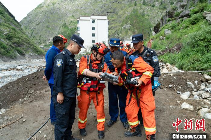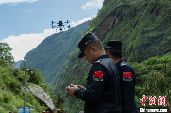 圖為9日,西藏移民管理警察與西藏消防等救援力量,操作無人機了解現(xiàn)場情況。肖富貴 攝