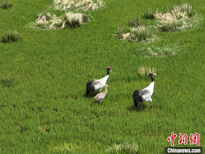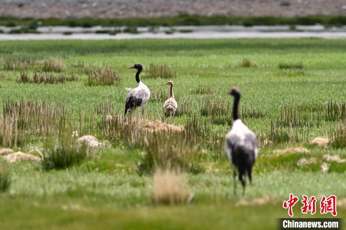 7月10日,在海拔4700米的西藏自治區(qū)那曲市申扎縣濕地里,黑頸鶴一家在悠閑覓食。黑頸鶴是中國國家一級(jí)重點(diǎn)保護(hù)野生動(dòng)物,屬高原特有鶴類,主要棲息于海拔2500米至5000米的高原沼澤地、湖泊及河灘等濕地環(huán)境。每年四月起,成對(duì)的黑頸鶴陸續(xù)飛抵西藏自治區(qū)那曲市申扎縣,在此繁育后代。近年來,申扎縣持續(xù)加強(qiáng)生態(tài)修復(fù),濕地面積擴(kuò)大、水質(zhì)改善,為黑頸鶴等珍稀物種提供了理想家園。中新社發(fā) 毛建軍 攝