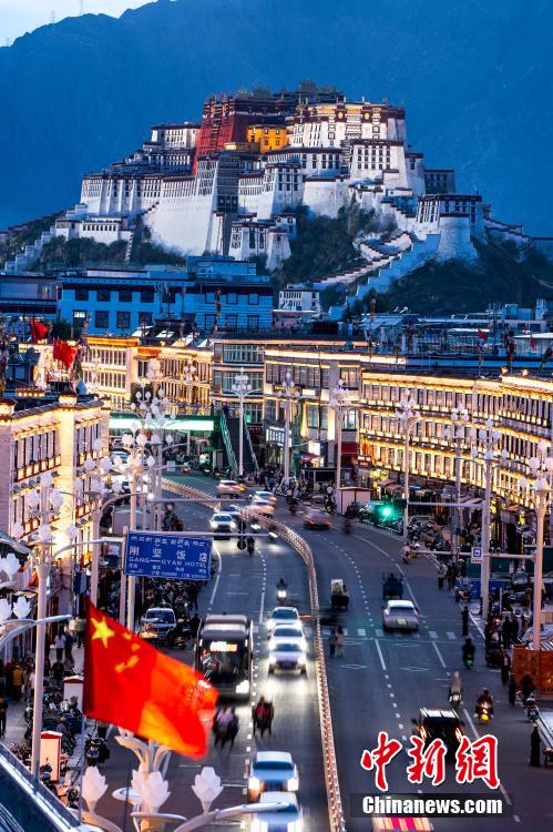 7月14日晚,在西藏拉薩,亮燈后的布達(dá)拉宮與北京東路交相輝映,夜色璀璨奪目。中新社記者 張祥毅 攝