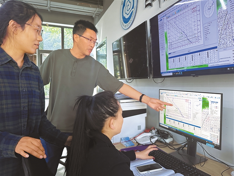 潘貴元(中)和同事討論氣象業(yè)務(wù)工作。記者 周婷婷 平措郎加 攝