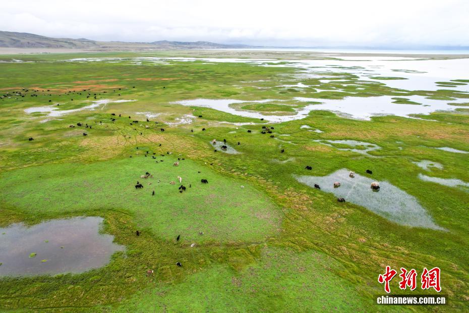 7月22日,在西藏阿里地區(qū)普蘭縣霍爾鄉(xiāng),牧民在瑪旁雍錯濕地上放牧牦牛。為實現(xiàn)更大的經(jīng)濟效益,霍爾鄉(xiāng)近年來探索建立牦牛養(yǎng)殖專業(yè)合作社,按當(dāng)?shù)刈匀粭l件合理分配牦牛放牧地點,并將牛奶進行加工銷售,2023年該合作社的年總收入達到60余萬元人民幣,帶動牧民人均增收2萬余元人民幣。(無人機照片)中新社記者 張祥毅 攝
