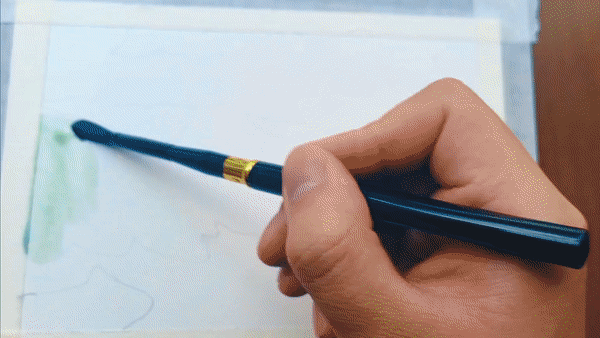 展開畫紙,最先捕捉到的是夏日魯朗層次豐富的綠意:嫩綠的草地鋪展開來,湖水映出清澈的藍(lán)綠色澤,遠(yuǎn)處的山巒泛著淡淡青色,層層疊疊。道路在明媚的陽(yáng)光下,潔白如雪,在綠色中蜿蜒,串聯(lián)起一個(gè)個(gè)藏式村落。