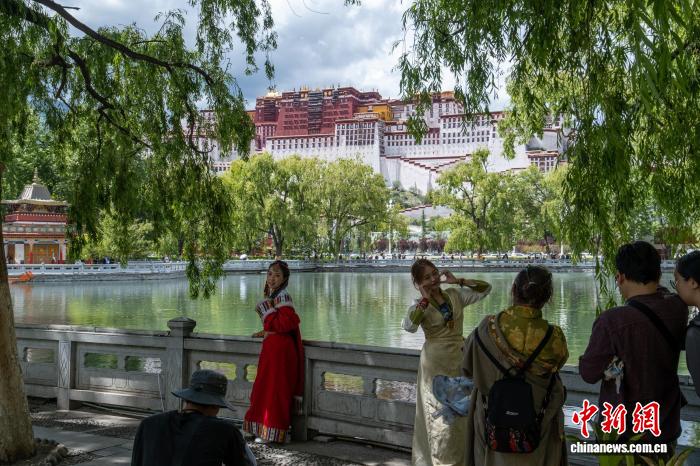 7月29日,游客在布達(dá)拉宮廣場(chǎng)東側(cè)人工湖附近“打卡”。中新社記者 江飛波 攝