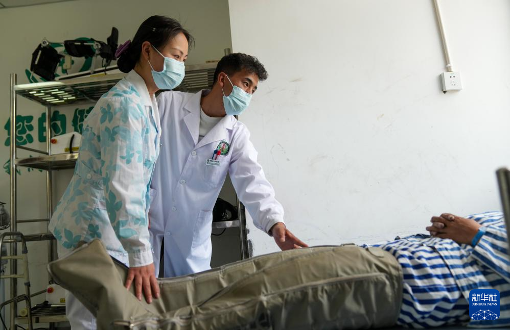 在昌都市洛隆縣人民醫(yī)院,從西藏大學(xué)醫(yī)學(xué)院畢業(yè)的醫(yī)生巴桑扎西和護(hù)士為患者進(jìn)行康復(fù)治療(7月21日攝)。新華社記者 晉美多吉 攝