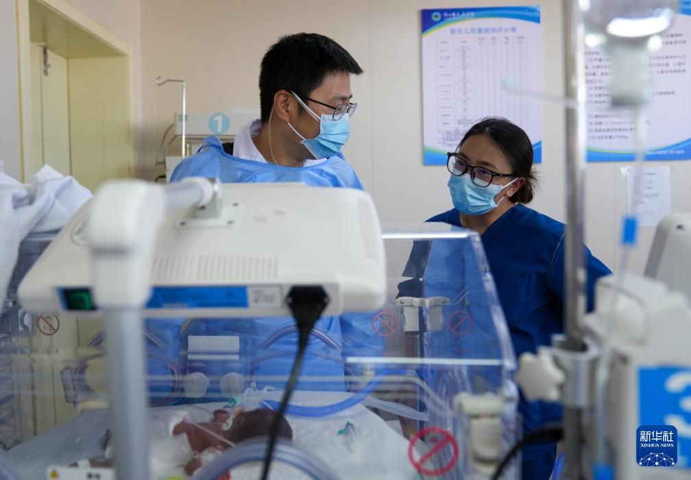 在那曲市人民醫(yī)院新生兒重癥監(jiān)護(hù)室,來自大連醫(yī)科大學(xué)附屬第一醫(yī)院的援藏醫(yī)生田聰亮(左)和護(hù)士旦珍合作為一名早產(chǎn)兒實(shí)施機(jī)械通氣治療(7月18日攝)。新華社記者 晉美多吉 攝