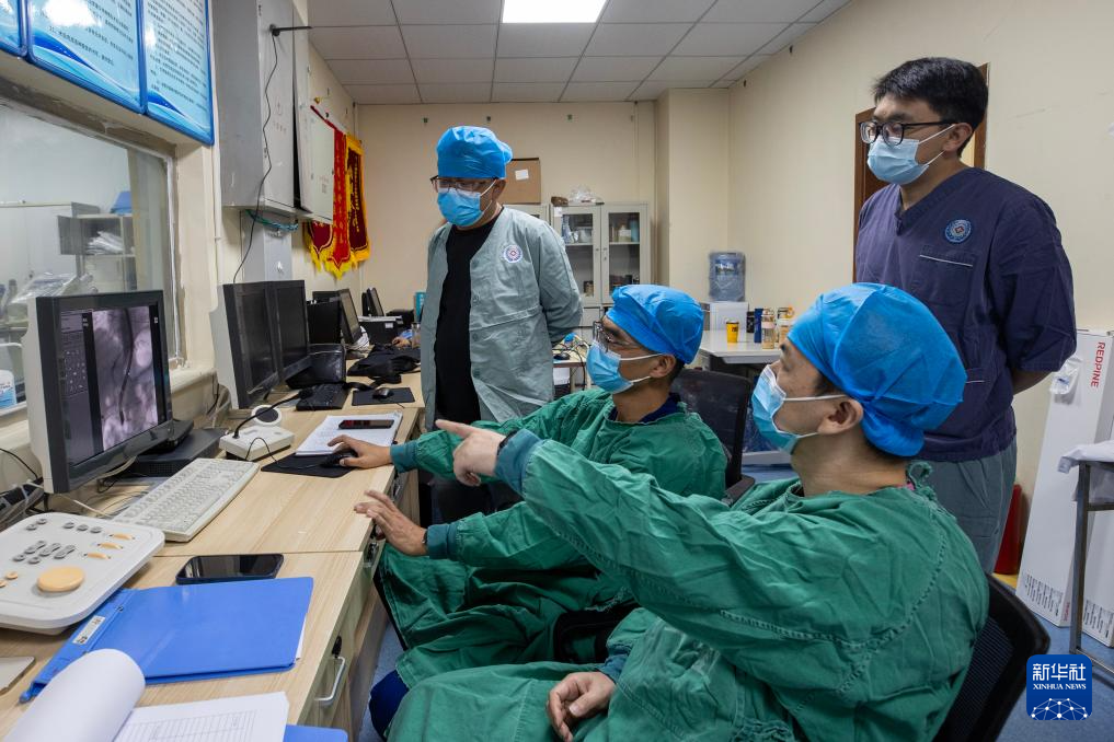協(xié)和醫(yī)院第十批援藏醫(yī)生王強(qiáng)(左四)、第十一批援藏醫(yī)生蔣青偉(左三)和西藏自治區(qū)人民醫(yī)院醫(yī)生扎西(左一)在拉薩為患者施行內(nèi)鏡逆行胰膽管造影術(shù)(8月5日攝)。新華社記者 姜帆 攝