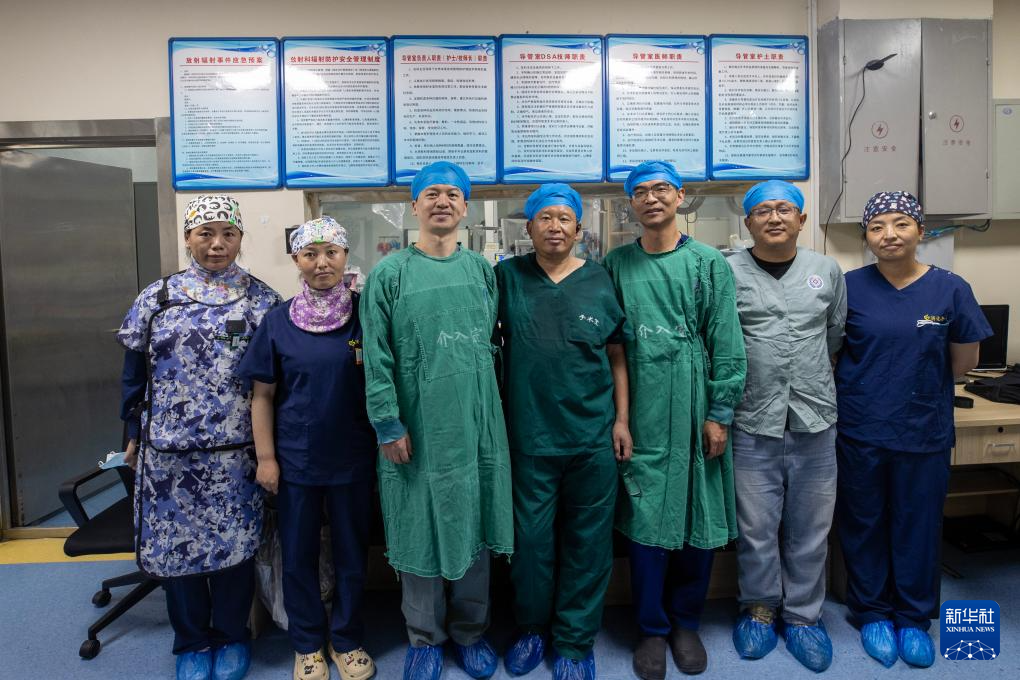 協(xié)和醫(yī)院第十批援藏醫(yī)生王強(qiáng)(右三)、第十一批援藏醫(yī)生蔣青偉(左三)和西藏自治區(qū)人民醫(yī)院醫(yī)生扎西(中)、旦增索朗(右二)及手術(shù)團(tuán)隊(duì),在拉薩為患者施行內(nèi)鏡逆行胰膽管造影術(shù)后合影(8月5日攝)。新華社記者 姜帆 攝
