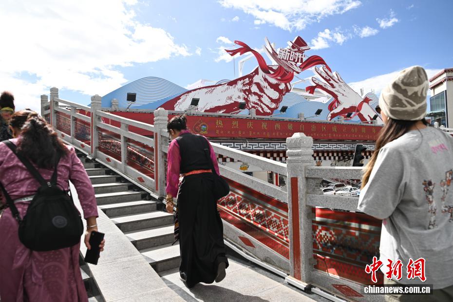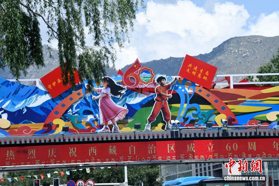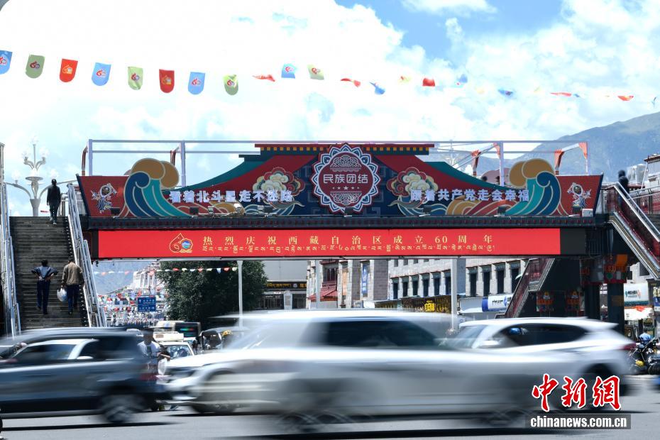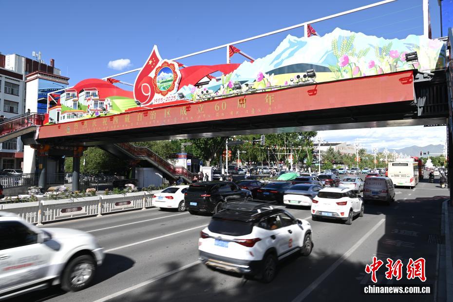 拉薩正以最美姿態(tài),迎接這一重要時(shí)刻。圖為裝扮一新的人行天橋。中新社記者 貢嘎來(lái)松 攝