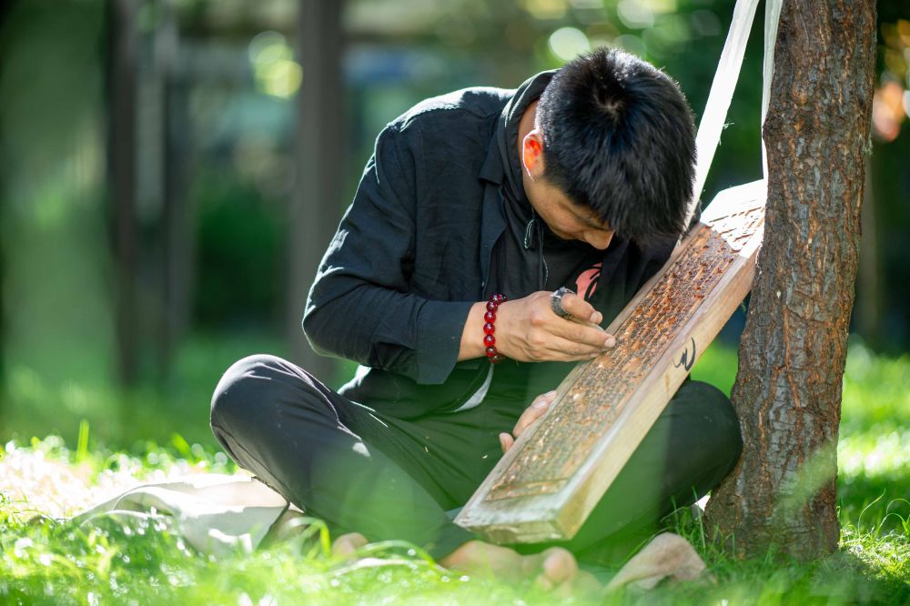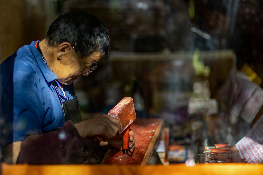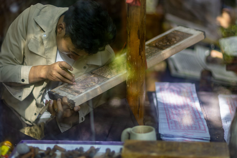 8月6日,一名雕刻師在雕刻中。西藏雪巴康雕版印刷制作技藝入選西藏自治區(qū)級(jí)非物質(zhì)文化遺產(chǎn)代表性項(xiàng)目名錄。