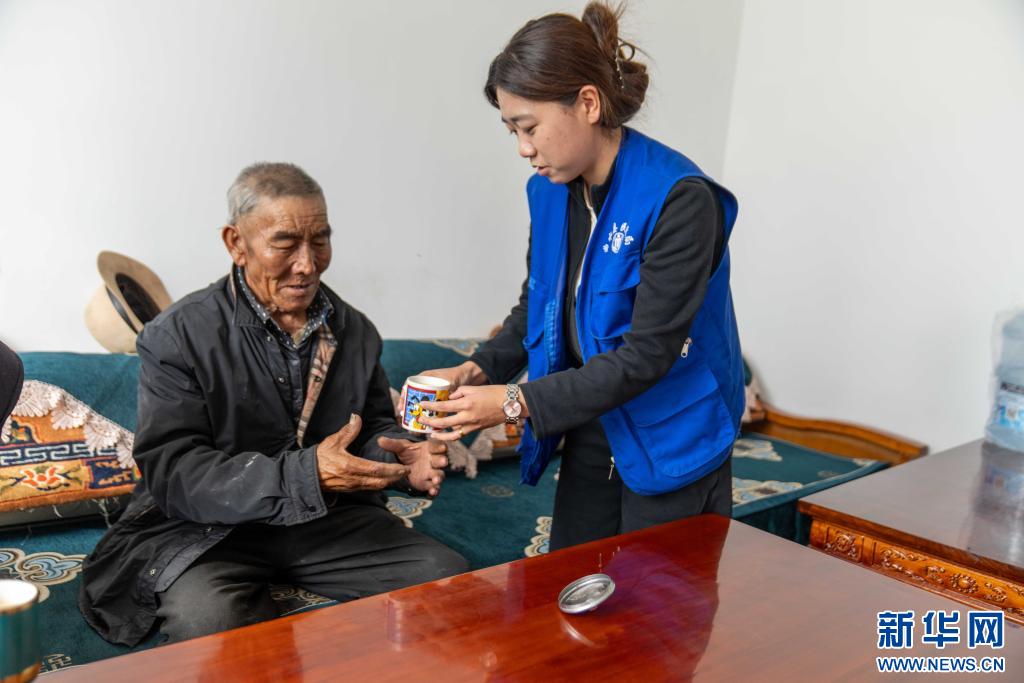 7月17日,在拉薩市曲水縣三有村幸福驛站日間照料室里,志愿者為老人端茶。新華社記者旦增尼瑪曲珠 攝