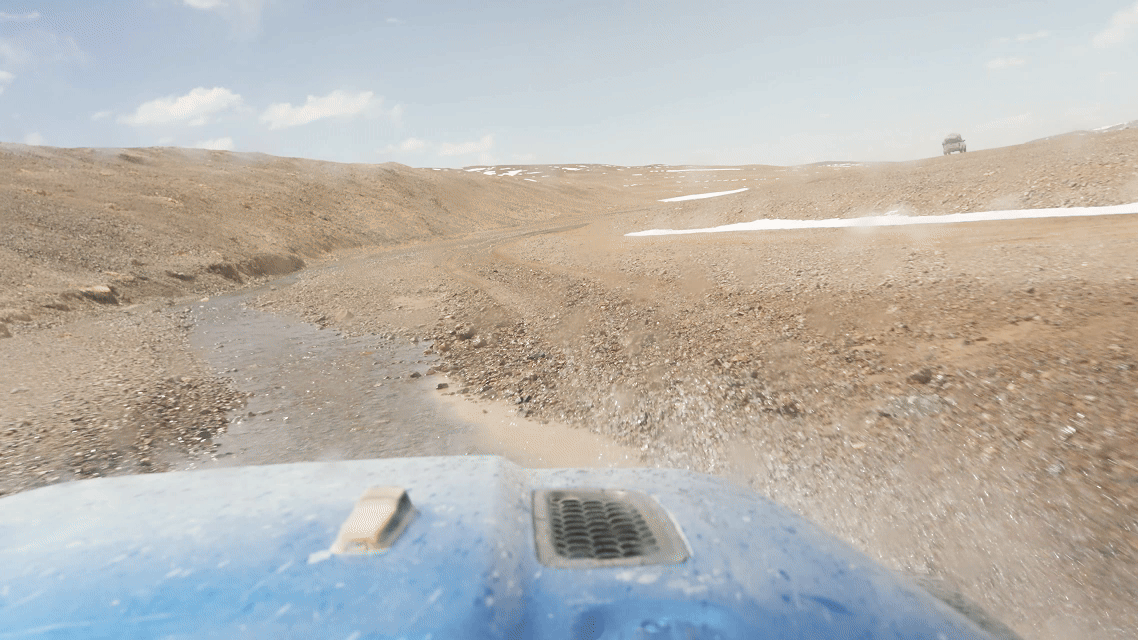 為了拍下野保員的日常工作以及藏羚羊大遷徙的宏大場面,我們一行跟隨巡護(hù)車,向著保護(hù)區(qū)核心區(qū)進(jìn)發(fā)。路面逐漸從“蜿蜒崎嶇的溪流”變成“波濤洶涌的大?!?,越野車內(nèi)好像一個(gè)迪斯科舞池,每一件東西都像被賦予了生命一般蹦蹦跳跳,伴隨著我們這些乘客的驚呼,連同引擎的轟鳴一起,揉碎在無邊荒原的呼嘯風(fēng)聲中。