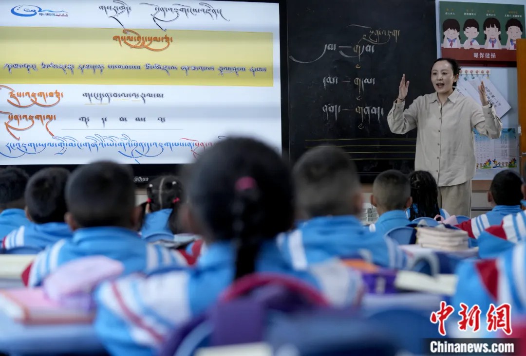 2025年3月10日,拉薩市第一小學(xué)藏語(yǔ)文老師桑旦旺姆使用科技設(shè)備在課堂上講授藏語(yǔ)。中新社記者 李林 攝
