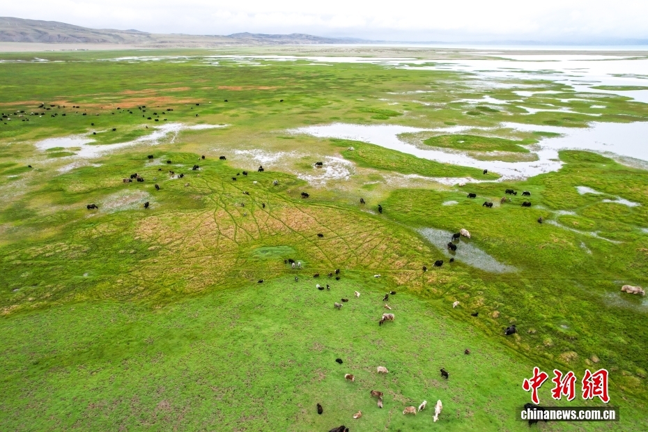 在西藏阿里地區(qū)普蘭縣霍爾鄉(xiāng),牧民在瑪旁雍錯濕地上放牧牦牛。(無人機照片)中新社記者 張祥毅 攝