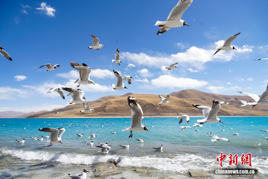 位于西藏自治區(qū)山南市境內(nèi)的羊卓雍措沿岸水鳥翔集。中新社記者 馬銘言 攝