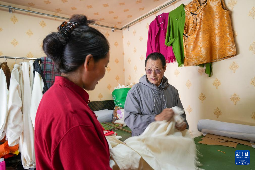 洛桑麥朗(右)在畢業(yè)學生開設的店鋪詢問生意情況(8月15日攝)。新華社記者 晉美多吉 攝