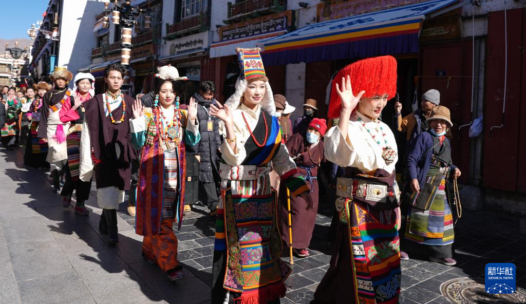 模特在拉薩八廓街“繁飾自然·衣彩拉薩——拉薩新年服飾秀”活動中巡游(2025年1月3日攝)。新華社記者 晉美多吉 攝