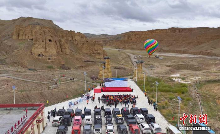 9月1日,參加“天上阿里·云巔自駕”活動(dòng)的游客在札達(dá)縣霞義溝土林景區(qū)參加開幕式(無人機(jī)照片)。閆志國(guó) 攝