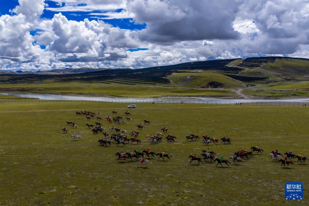 9月7日,騎手們?cè)趥鹘y(tǒng)大跑項(xiàng)目中馳騁(無人機(jī)照片)。新華社記者 丁增尼達(dá) 攝