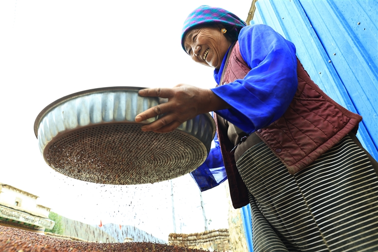 在莫沖村2組村民貢嘎頓玉的家門前,同樣是一派熱鬧的豐收場景。貢嘎頓玉正和妻子、女兒一起清理剛收獲的菜籽,顆粒飽滿的油菜籽堆成小堆,透著滿滿的幸福感。