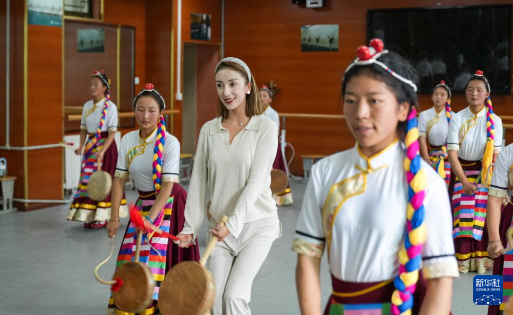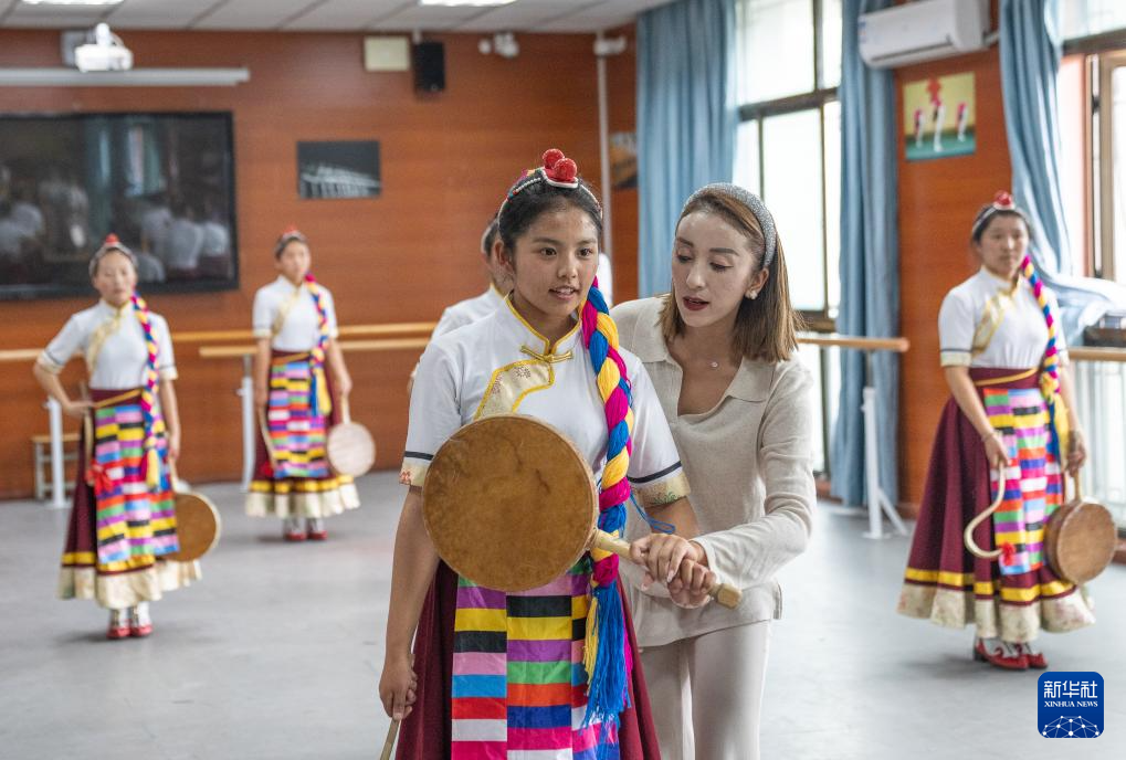 9月9日,在拉薩市第二中等職業(yè)技術學校,尼瑪卓瑪老師(右二)指導孩子們舞蹈動作。新華社記者 丁增尼達 攝