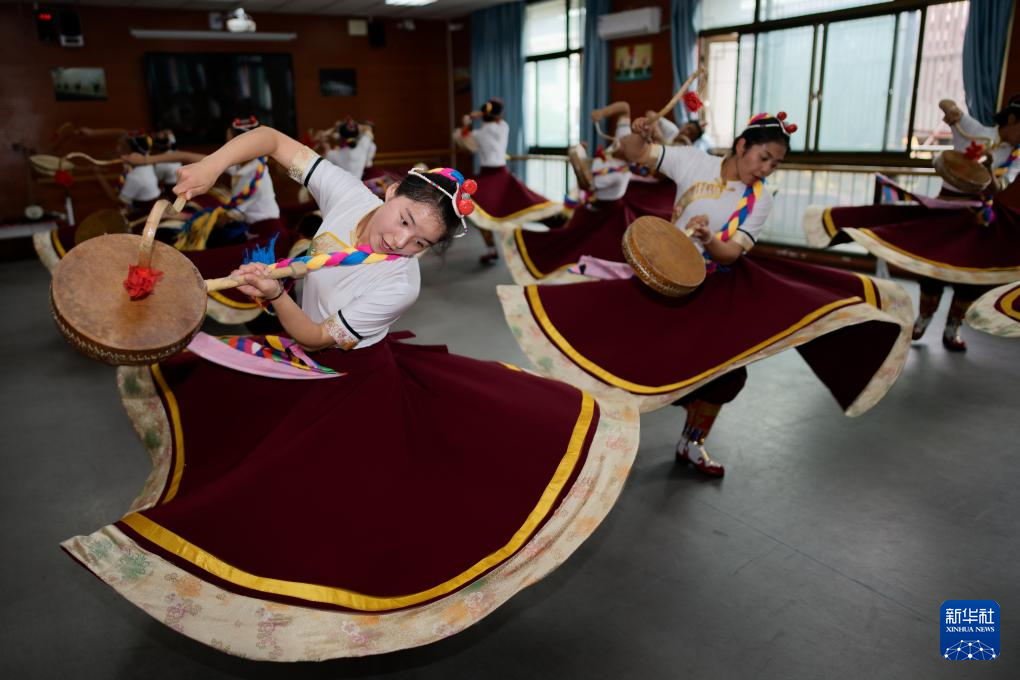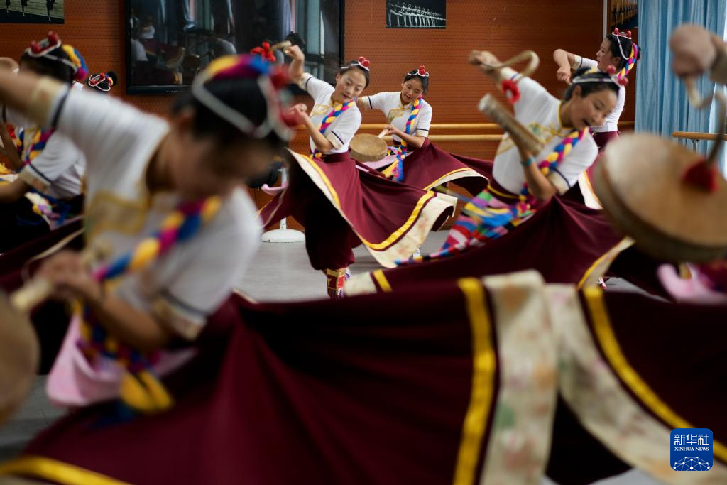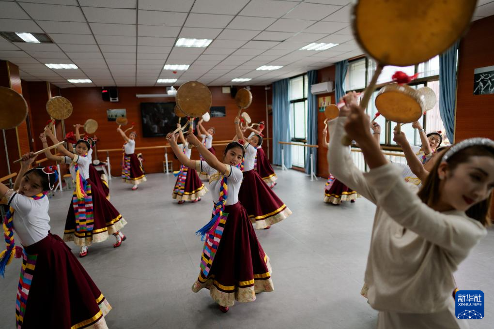 9月9日,在拉薩市第二中等職業(yè)技術學校,孩子們在練習熱巴舞。新華社記者 張笑宇 攝