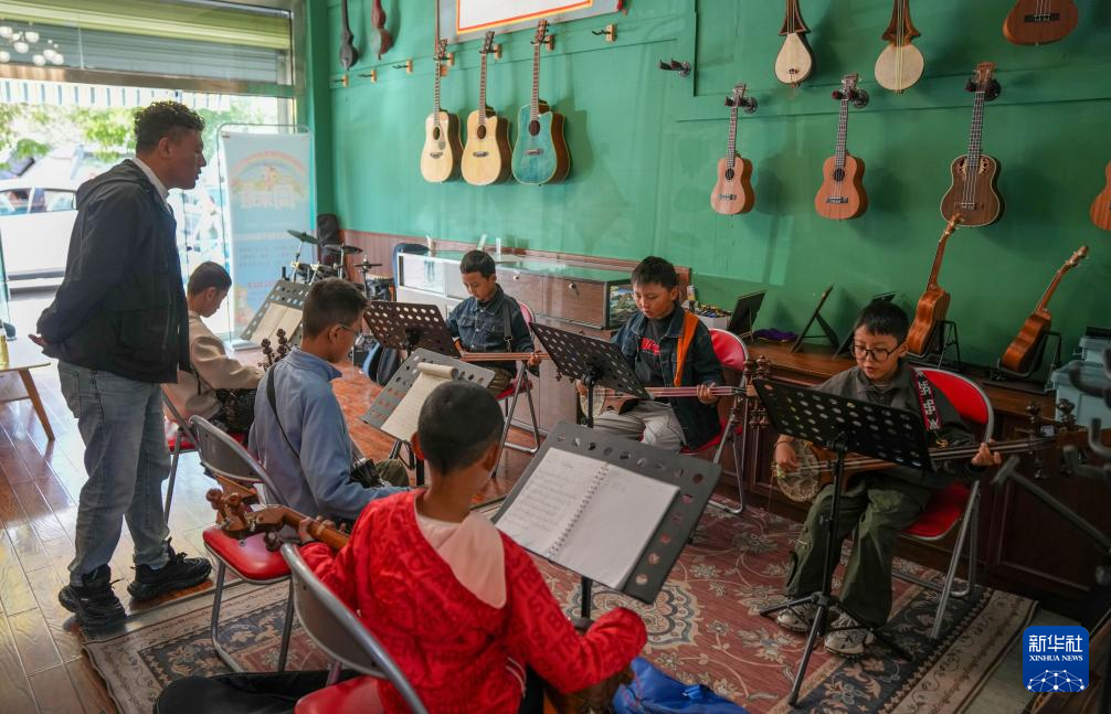 9月13日,在拉薩市古樂扎念琴行,桑嘎西熱老師在指導(dǎo)孩子彈奏扎念琴。新華社記者 晉美多吉 攝