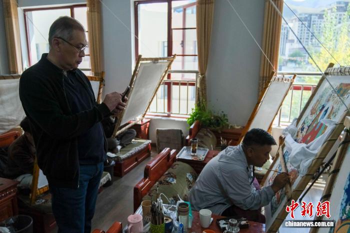 9月26日,哈薩克斯坦駐華大使努雷舍夫在西藏唐卡畫(huà)院觀看了解唐卡繪制過(guò)程。中新社記者 江飛波 攝