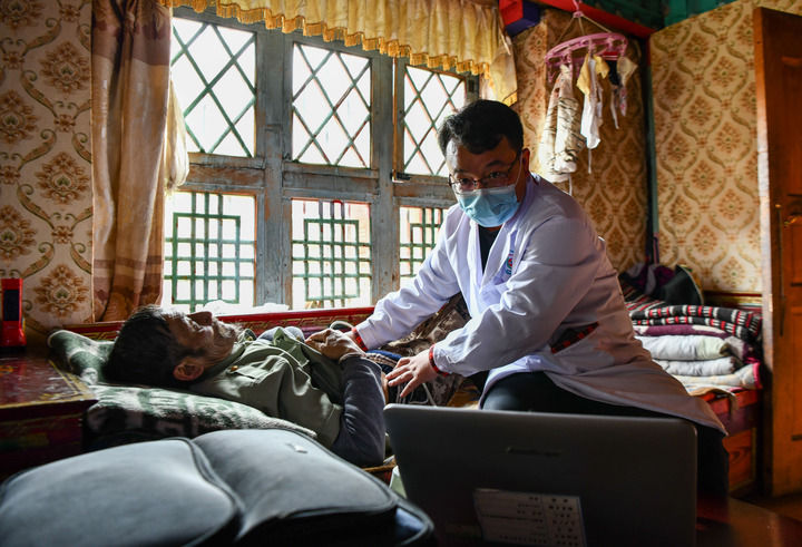 2023年6月12日,廣東珠海市人民醫(yī)院第七批援藏醫(yī)療隊王旭彤醫(yī)生在給西藏米林市吞不絨村患者珠杰檢查身體。新華社記者 晉美多吉 攝