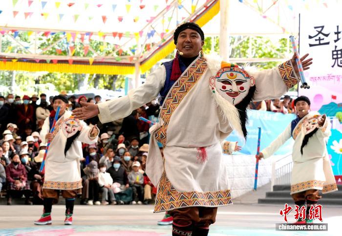 10月19日,“格?;ū崩_市第六屆縣(區(qū))藝術(shù)團文藝調(diào)演頒獎活動在布達拉宮腳下的宗角祿康公園舉行。現(xiàn)場,拉薩市各縣(區(qū))藝術(shù)團帶來精彩節(jié)目。圖為文藝調(diào)演頒獎活動上的文藝表演。中新社記者 李林 攝